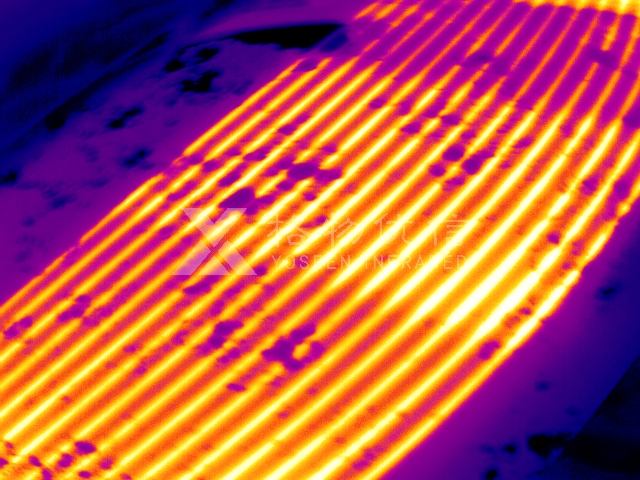 對后風擋玻璃(后視鏡)進行溫度分析,主要用于檢測整個玻璃的電阻絲均勻分布情況,電阻絲的加熱速度等。因此可以利用紅外熱像儀快速、方便獲取后擋風玻璃(后視鏡)在電阻絲加熱過程中的熱像,分析電阻絲的溫度分布,整塊玻璃的溫度上升趨勢。避免由于電阻絲分布不均勻或某個點的電阻出現(xiàn)異常,造成玻璃局部受熱,致使玻璃損壞。